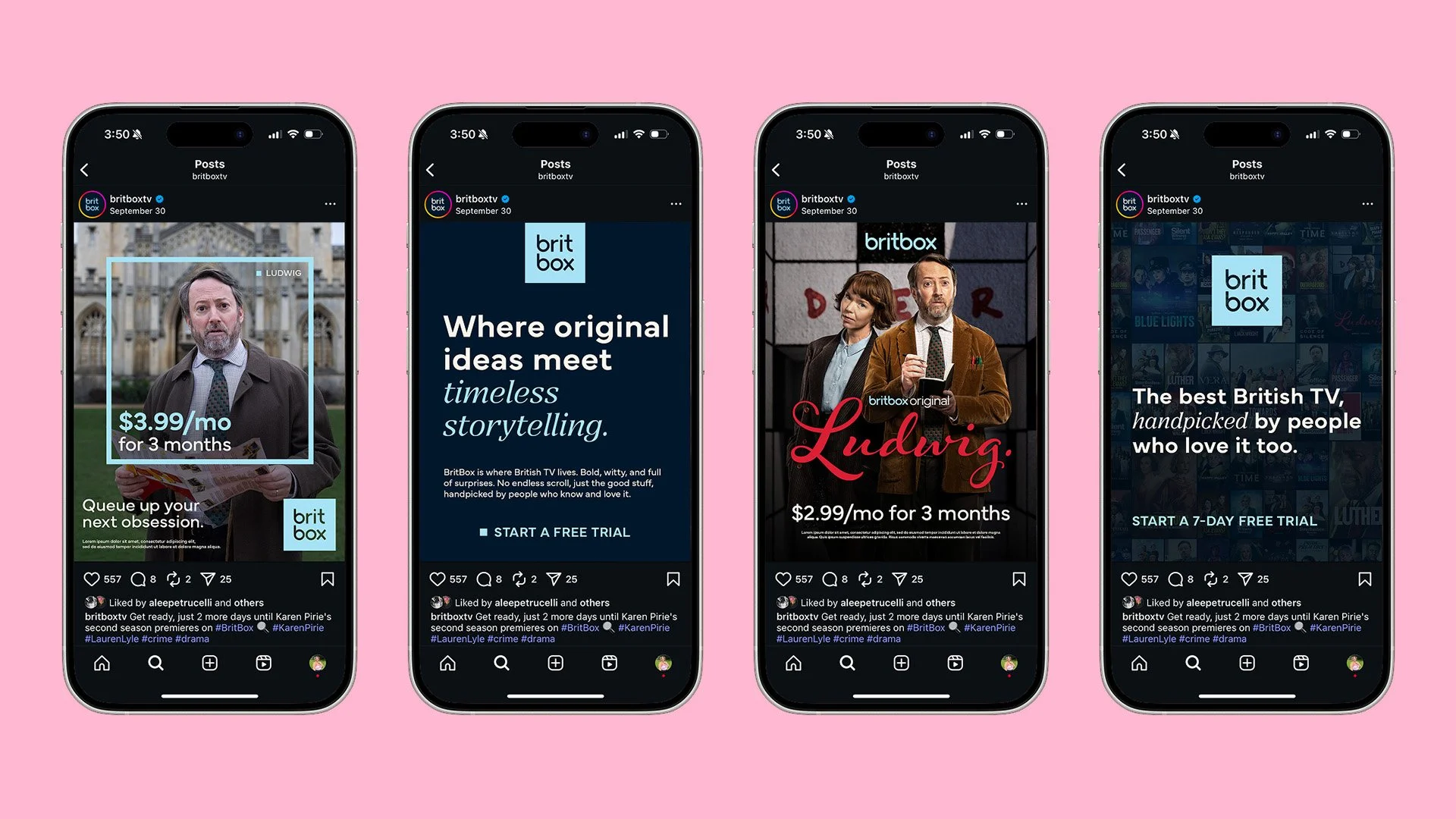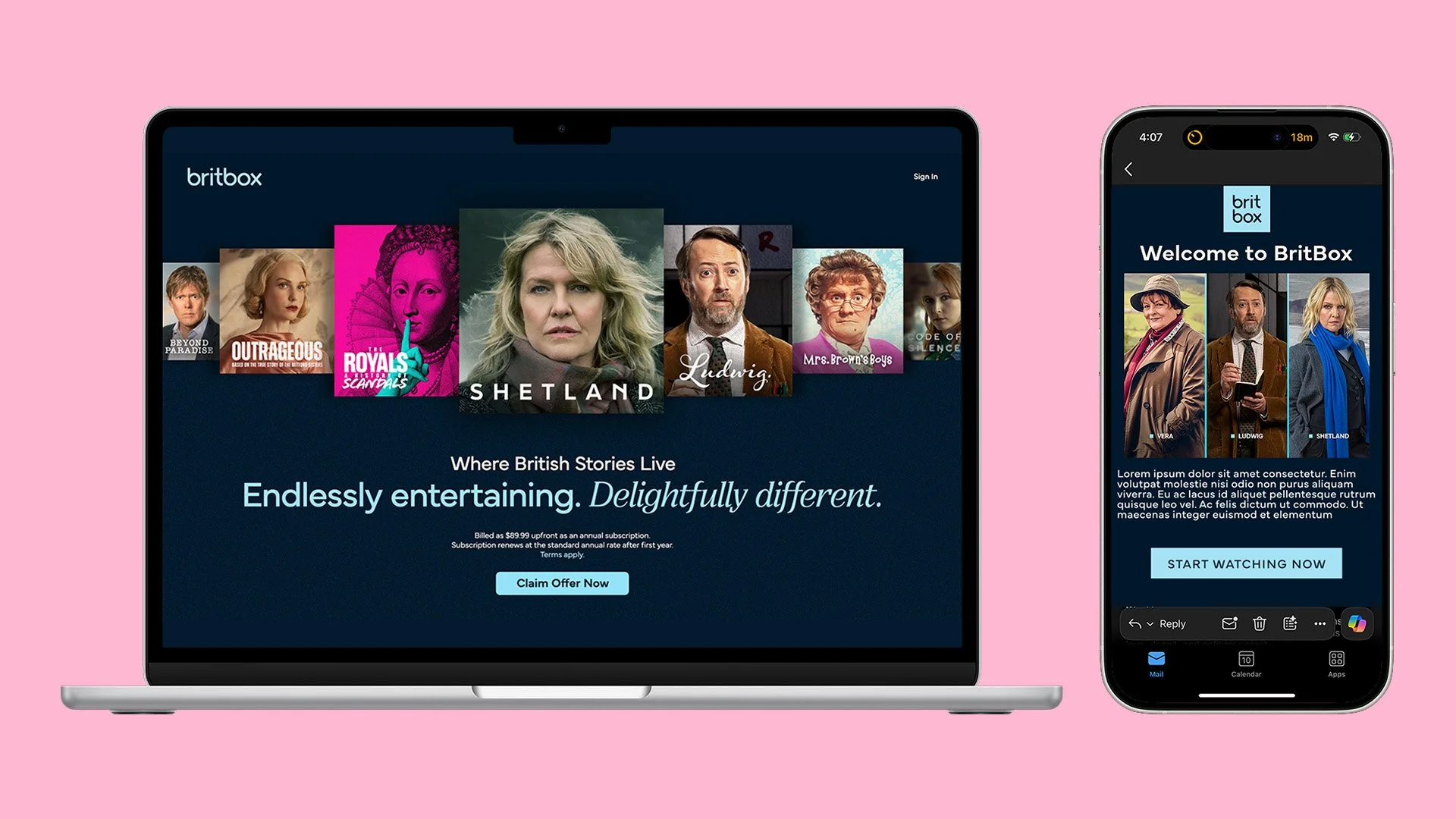 At the heart of it all is the box motif, which moves beyond being just a logo container and becomes a framing device. It shows up across marketing, UI, and promos to spotlight characters and moments, creating a quiet but distinctive BritBox signature—even when the logo isn’t front and center.